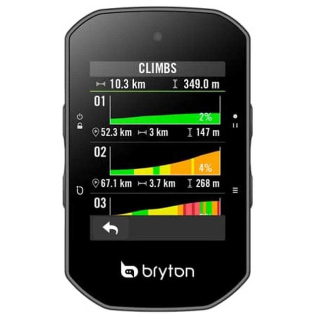Specifikace Rozlišení displeje: 240 × 320 pixelů Provozní teplota: –10 °C~50 °C Historie záznamů: 300 hodin Podporované satelity: GPS, Glonass, Galileo, Beidou, QZSS Velikost displeje: 2,4" Vodotěsnost: IPX7 Životnost baterie: Až 24 hodin Typ displeje: 2,4" barevný displej TFT LCD Dotyková obrazovka: Ano Barometrický výškoměr: Součástí dodávky Bezdrátové připojení: BLE (iOS a Android) Kompatibilita s držákem: Vlastní montážní systém Bryton (na držáky třetích stran se nevztahuje záruka)