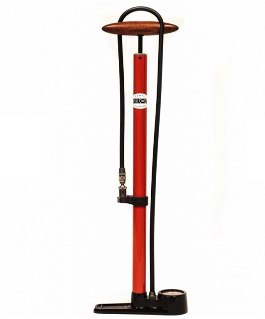 Silca Pista pumpička v červené barvě. S ocelovým tělem, manometrem 220 PSI (15 atm) a dřevěnou rukojetí.